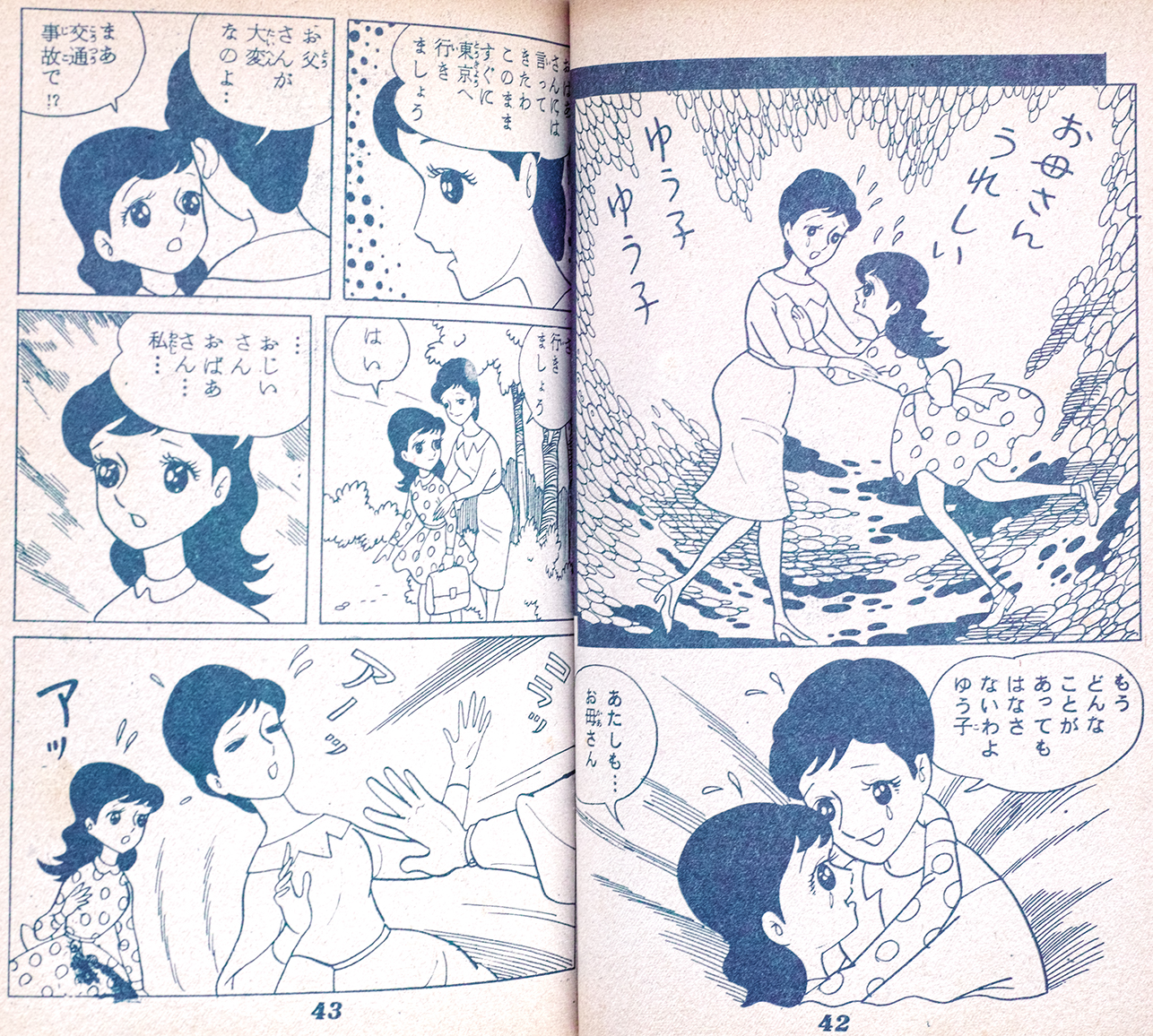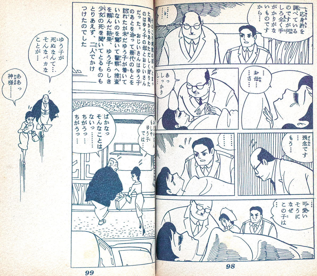p98で主人公のゆう子が死んだ。。まだページはかなり残っているぞ。この頃の少女漫画には、死んだ人間が生きかえるような展開はない。母とおじいさんがゆう子を回想するにしてもそんなにページは必要ないだろう。考えられるのはこの話は早々に終わって、残りのページには別の作品が収められること。