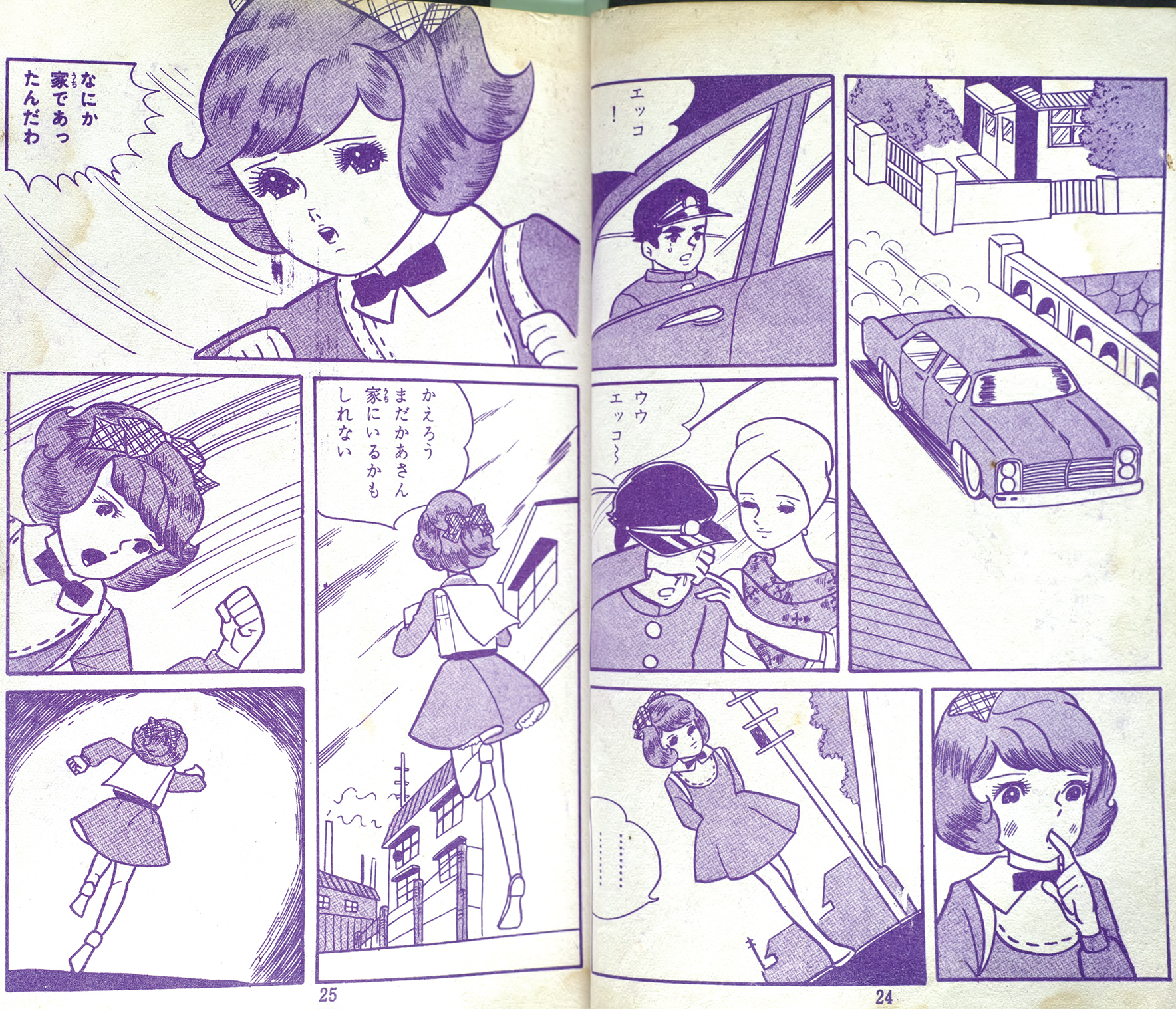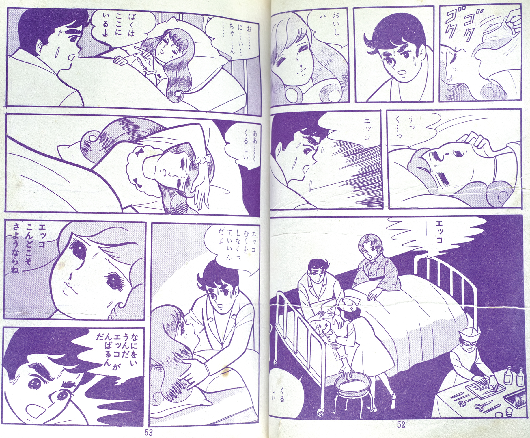 松尾美保子先生同様、浦野千賀子作品にもダンナのペンが入っている、名胡桃ゆう(貞安達明)先生。あ、貞安達明は義弟のさだやす圭先生のことかな? 女を浦野先生が、男を貞安先生が描いておられる。女性の顔は牧美也子先生風ながら、すでに浦野先生らしさも伺える、が体の描写はまだぎこちない。男性の方はちばてつや先生風で顔・体ともこなれている。松尾美保子先生ほどの魅力がないからか、はっきり違うとわかってもこの共作には不満はない。